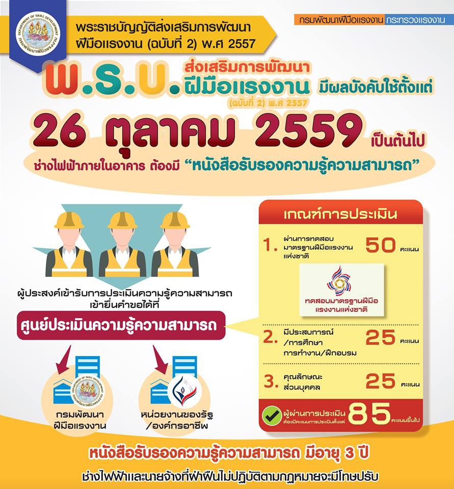 พ.ร.บ.ส่งเสริมการพัฒนาฝีมือแรงงาน (ฉบับที่ 2) พ.ศ.2557 มีผลบังคับใช้ตั้งแต่ 26 ตุลาคม 2559 เป็นต้นไป ช่างไฟฟ้าภายในอาคารต้องมี "หนังสือรับรองความรู้ความสามารถ